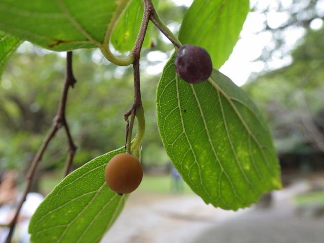 アサ科。高さ20m、径1mにもなる落葉高木。花は、若葉の芽と同時に咲くが、あまり目立たない。実は緑色から10月頃赤褐色に熟す。この実を野鳥が好み、種を方々に運ぶ。葉は、日本の国蝶オオムラサキの幼虫の餌となる。