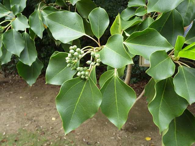 ウコギ科。暖地の日陰に生える。ほうきを逆さにしたような樹形をした常緑樹。7~8月、枝先に黄緑色の小さな花が多数つく。実は長い柄の先きに放射状につき、10月になると緑の実は次第に紫色に変わり、色は濃さを増してくる。葉は厚くしなやかで光沢があり、若木は3~5裂することが多いが、成木は楕円形、卵形になる物が多い。常緑樹であるが、秋から冬にかけ下部の葉は黄色くなって落葉する。冬芽は扁平で三角形をしている。