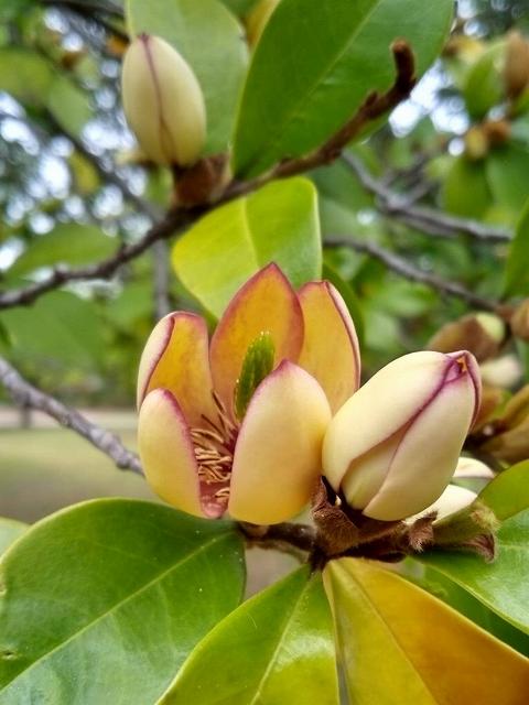 モクレン科。中国原産、江戸時代に渡来。5~6月、3cmほどの黄白色の花が咲きバナナに似た強い香りがする。