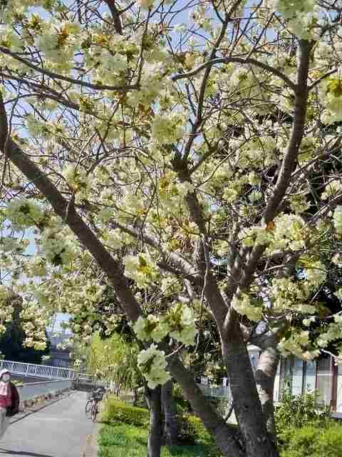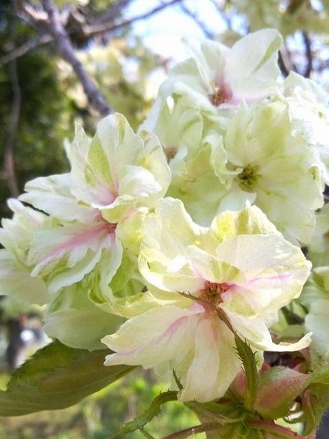 バラ科。オオシマザクラ系の園芸種。花の直径は4~5cmほどで、12~14枚ほどの花弁が重なった八重咲である。開花は4月下旬~5月上旬。咲き始めはほぼ黄緑色で、開花から数日経つと黄色っぽい花となり、やがてピンク色のストライプが入る。樹皮は暗褐色で樹齢を重ねると横筋が入る。