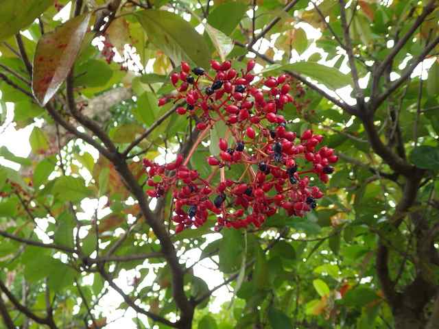 実の房には黒い熟果と、赤い未熟果が入り混じる