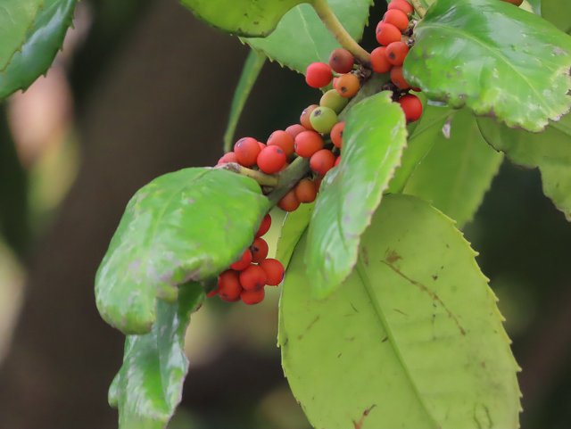 モチノキ科の常緑高木。雌雄異株(しゆういしゅ)。西日本の暖地に自生し、また植栽される。葉が厚くて大きく、21cm前後にもなる。葉の裏に尖ったものなどで字を書くと黒く浮き上がるので、別名「はがきの木」とも呼ばれる。昔はお坊さんが経文を書いたと言う。春には小さな黄緑色の4弁の花が、葉のつけねにかたまって咲く。果実は11月頃に密集して赤く熟す。