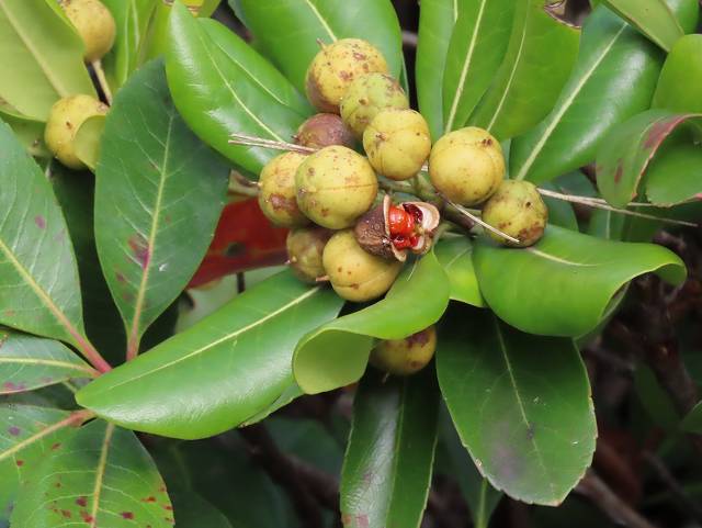 実は熟すと割れて中には、べたつきのある赤い種子がある