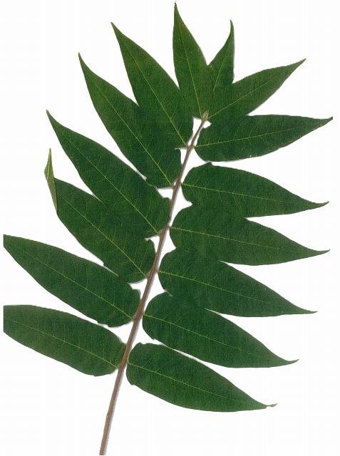 ニガキ科の落葉高木。中国北部の原産。雌雄異株(しゆういしゅ)。葉は互生し、6~12対の小葉から成る大きな羽状複葉で1m近くにもなる。小葉の基部に腺体(粒状のもの)がある。枝先に円錐花序を出し、多数の緑白色の小花を開く。果実は長さ4cmほどになり、周囲に翼を持った豆の鞘のような形で、回転しながら遠くまで飛ぶ。樹皮は明るい灰色でほぼ平滑だが表面に波形の浅い裂け目があり縦の皺状に見える。
