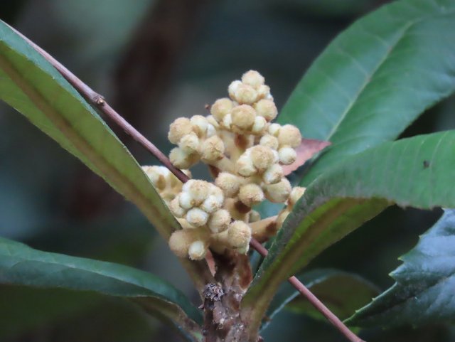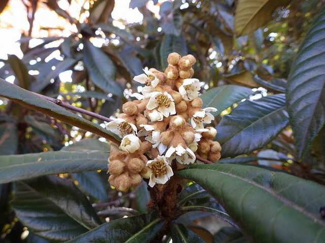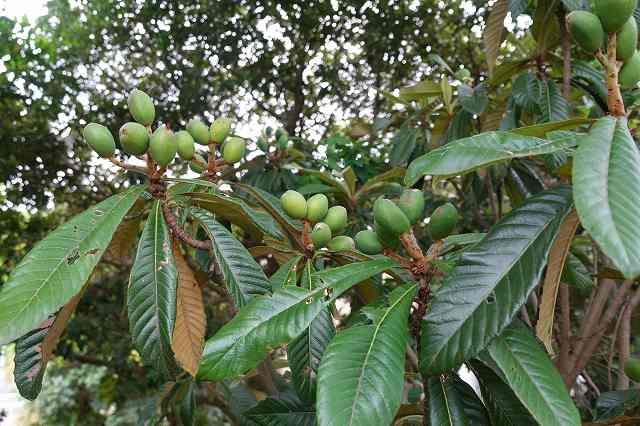 バラ科。石灰岩地帯にも自生するが、改良品種は果樹として広く栽培されている。高さ10mになる常緑高木。葉は15~20cmと大きく、表面には光沢があるが、裏面には褐色の綿毛が密生する。11~翌1月に枝先に芳香のある白い花を密に咲かせる。果実は5~6月に黄橙色に熟す。